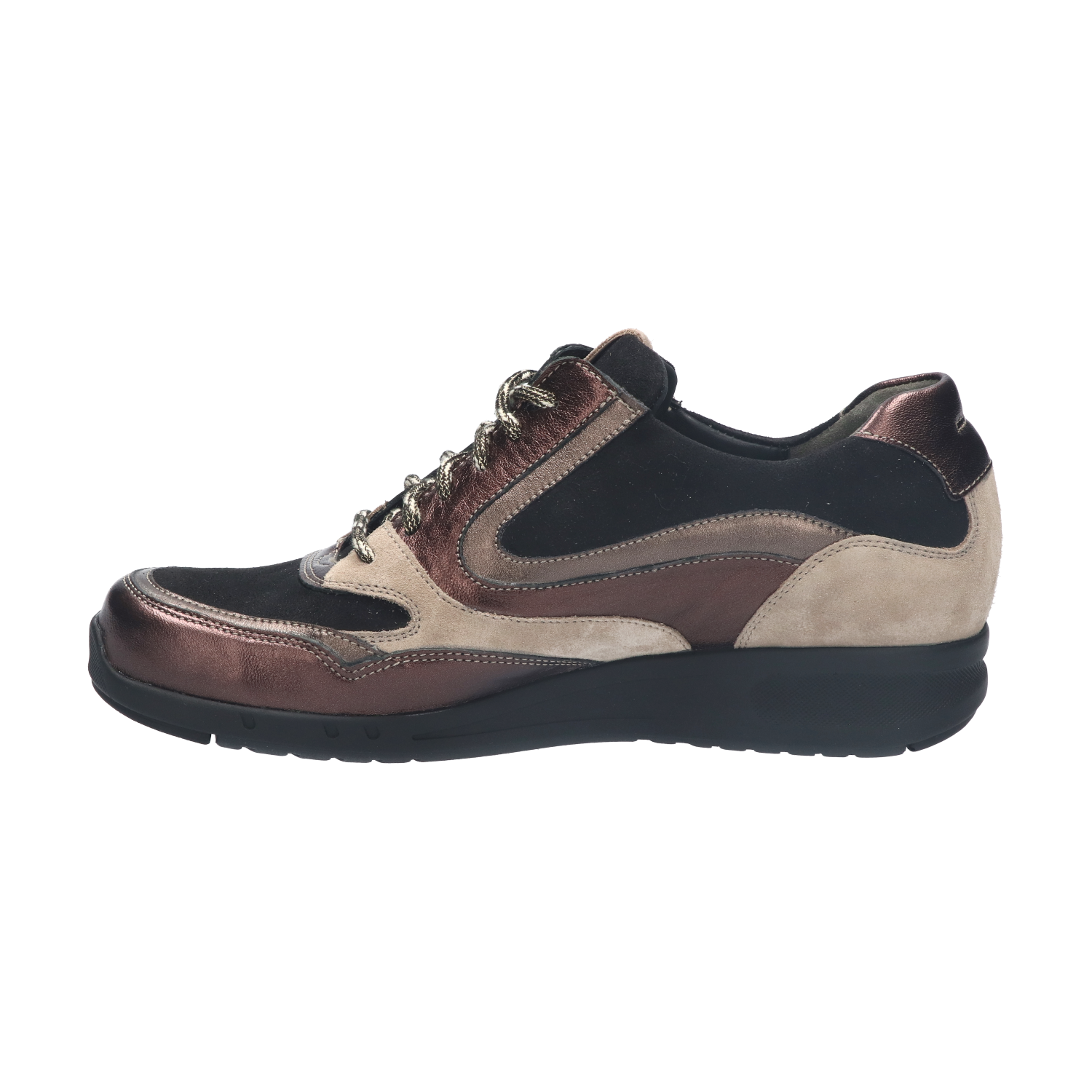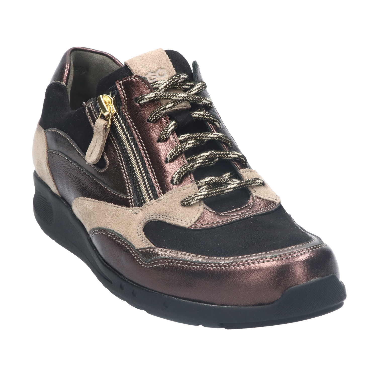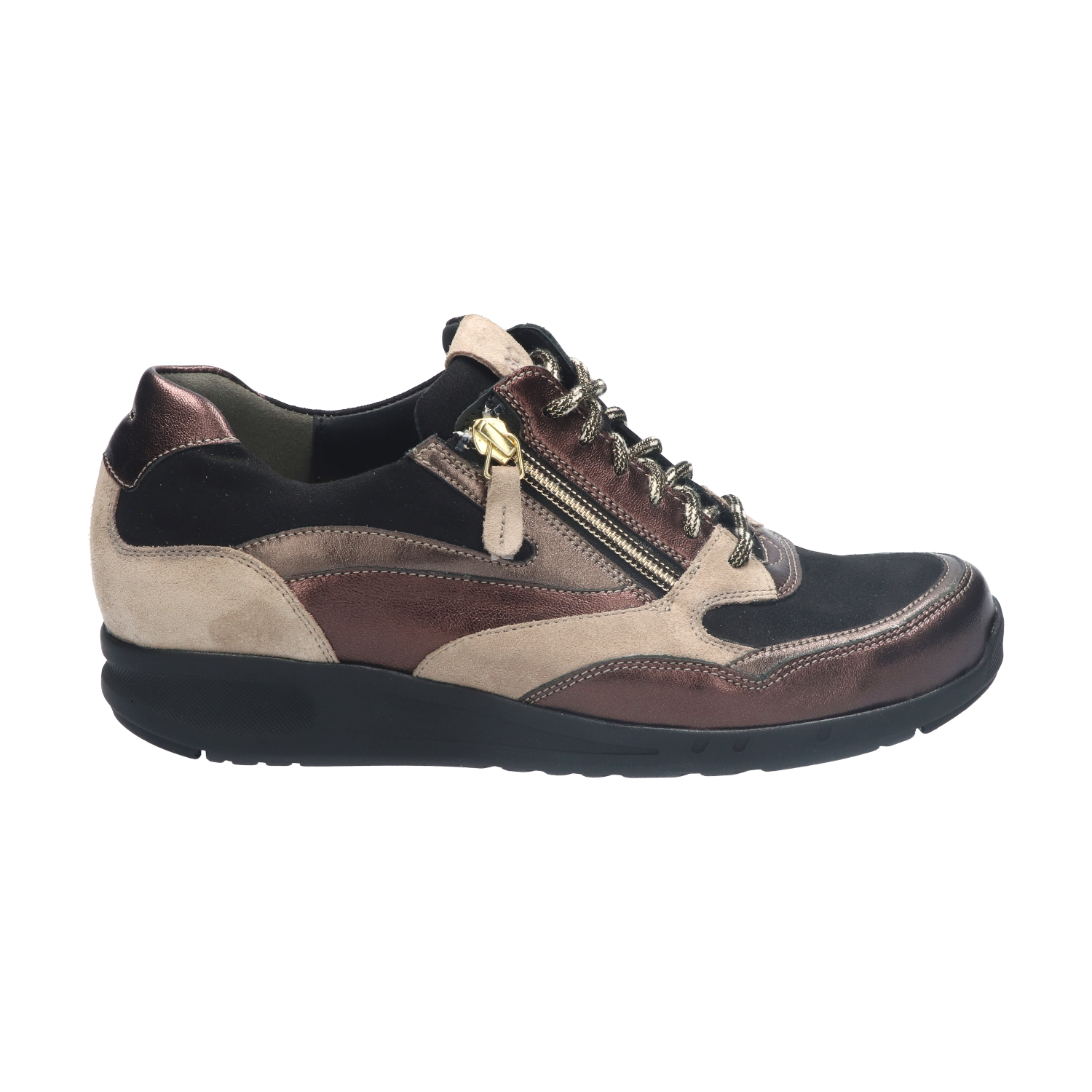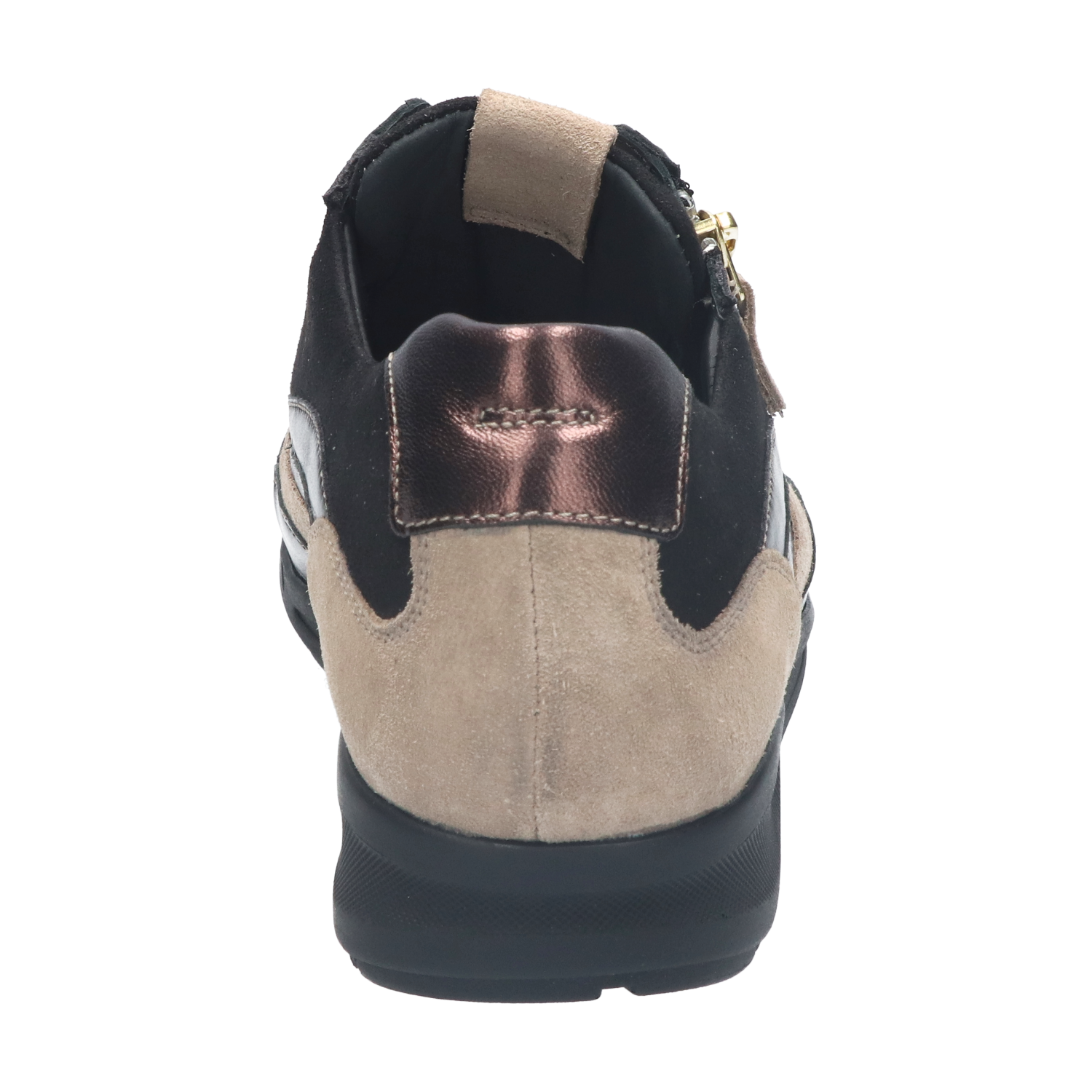 Het bovenwerk valt op door een spannende mix van materialen en een verfijnde afwerking. De afgeronde lijnen geven de sneaker een chic uiterlijk. Dankzij de veter-rits-combinatie is het model eenvoudig aan- en uit te trekken én goed af te stellen.