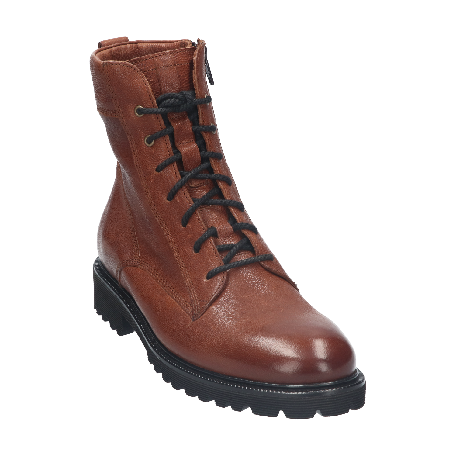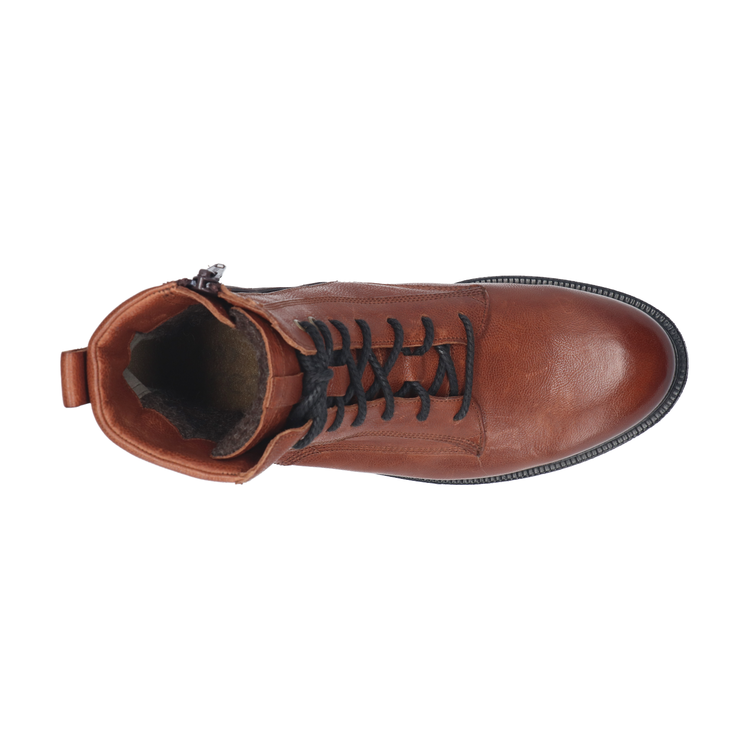 Het bovenwerk is verrijkt met een stoere treklus op de achterbies, een zachte beschermkraag rondom de enkels en een hoge tong. Het binnenwerk is voorzien van een zachte, warme voering. De combinatie van stoere details en vrouwelijke elegantie maakt dit paar uniek. Let op de door stikwerk gecreëerde belijningen, de grove veters en de contrasterende rand van de loopzool.
